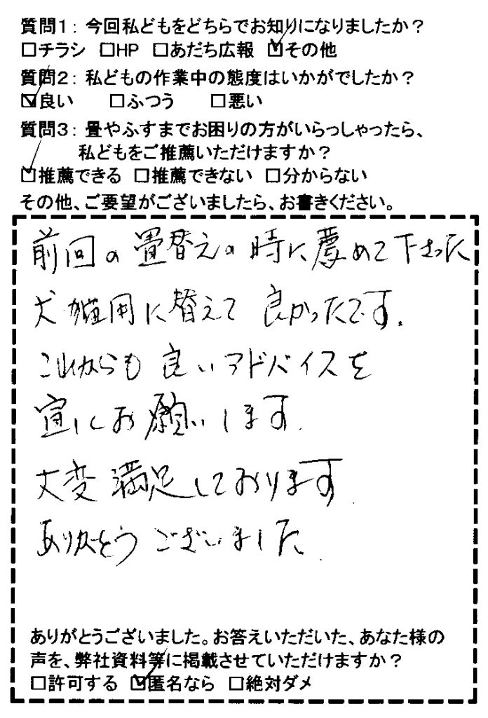 「前回の畳替えの時に薦めて下さった犬猫用に替えて良かったです。これからも良いアドバイスを宜しくお願いします。大変満足しております。ありがとうございました。」