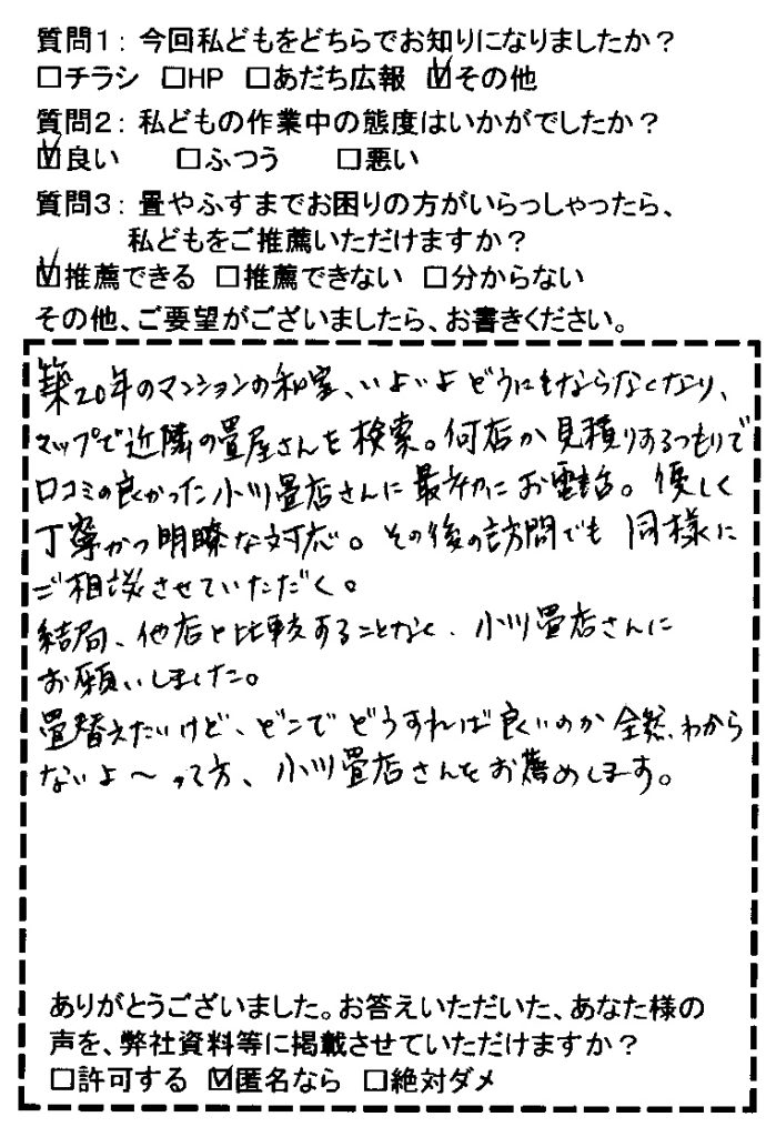 「築20年のマンションの和室、いよいよどうにもならなくなり、マップで近隣の畳屋さんを検索。何店か見積りするつもりで、口コミの良かった小川畳店さんに最初にお電話。優しく丁寧かつ明瞭な対応。その後の訪問でも同様にご相談させていただく。