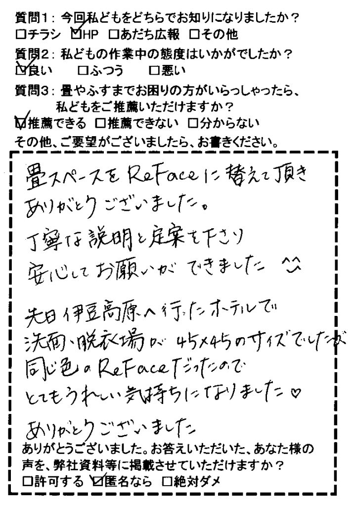 「畳スペースをReFaceに替えて頂きありがとうございました。